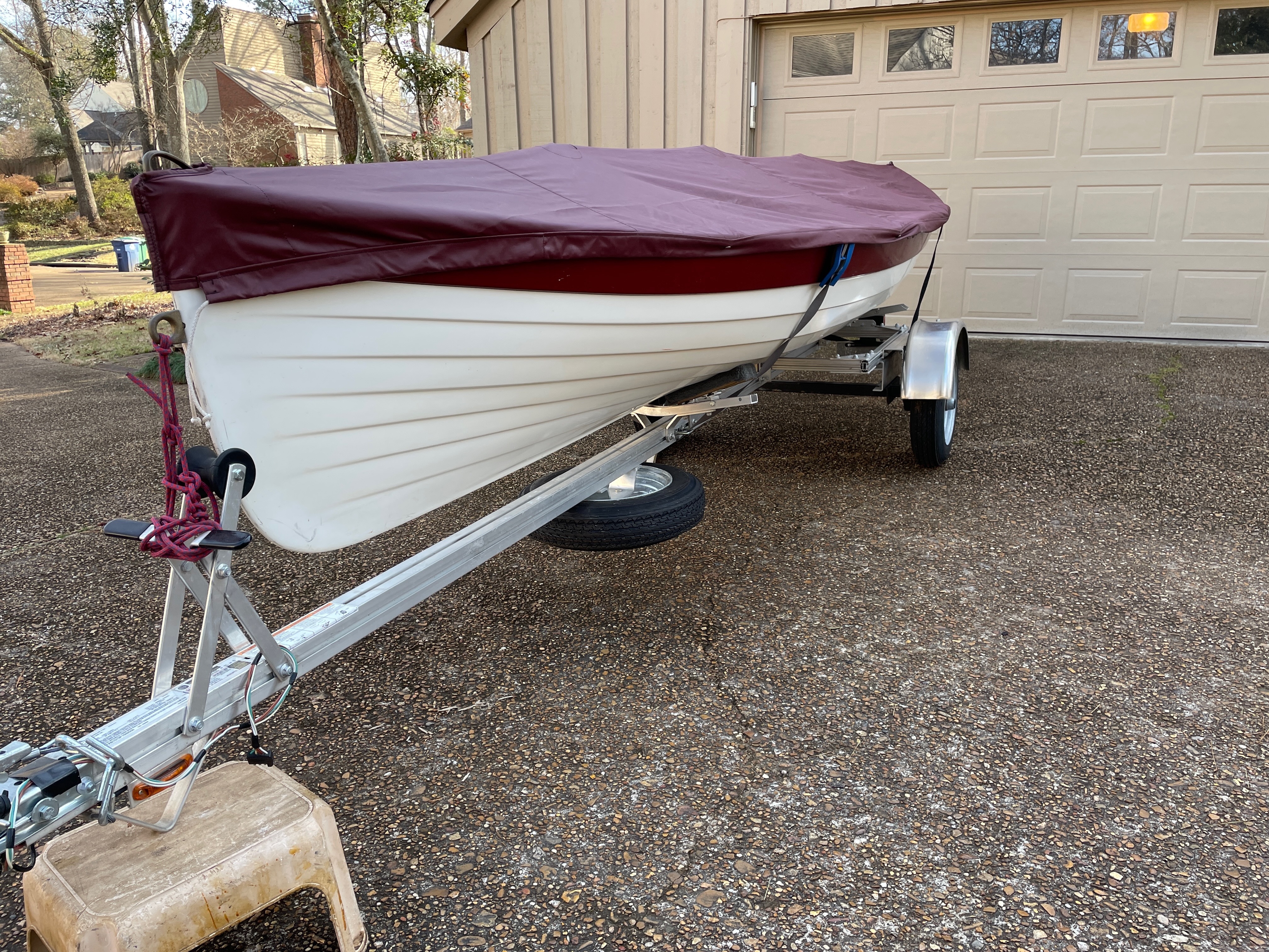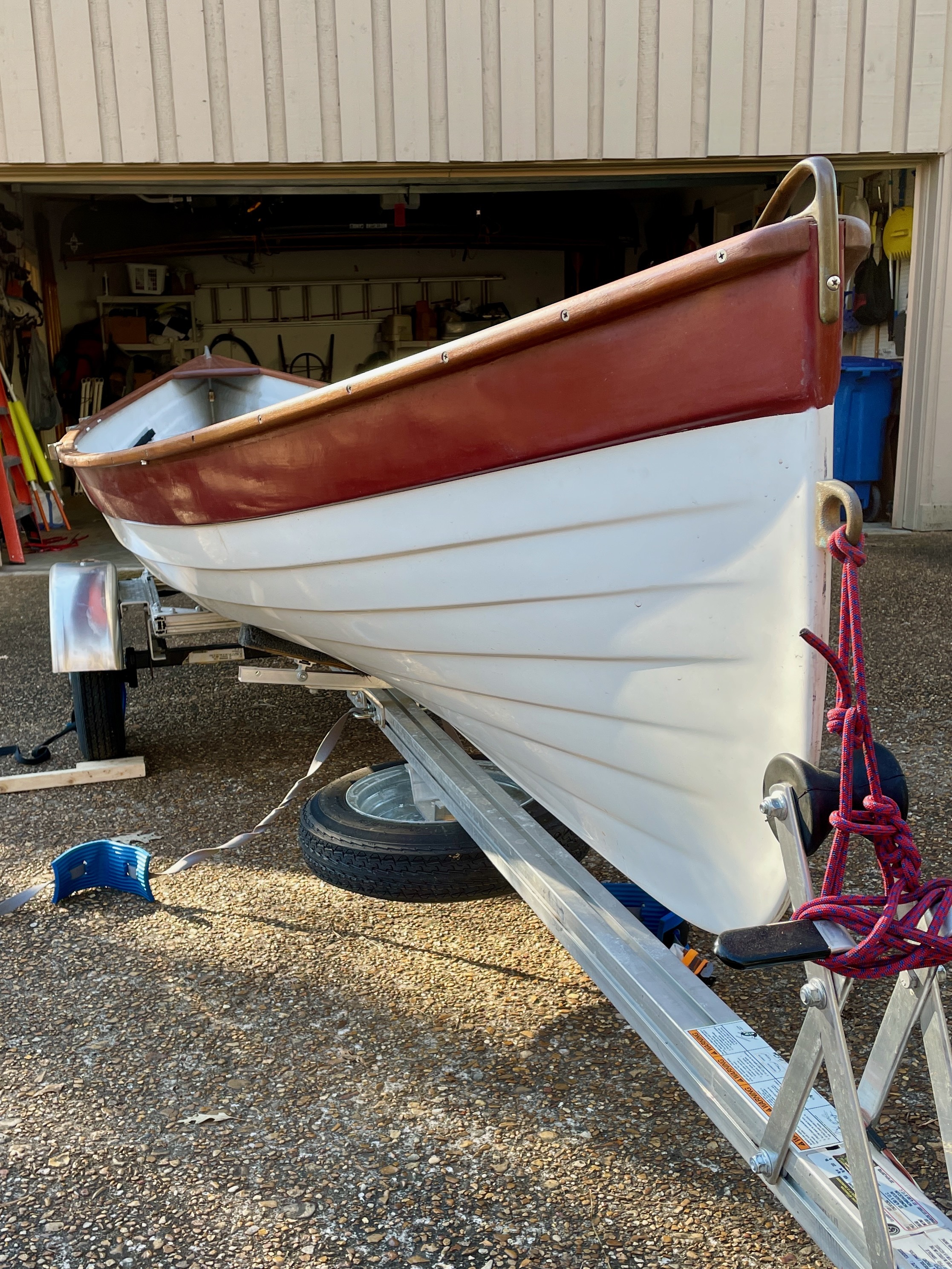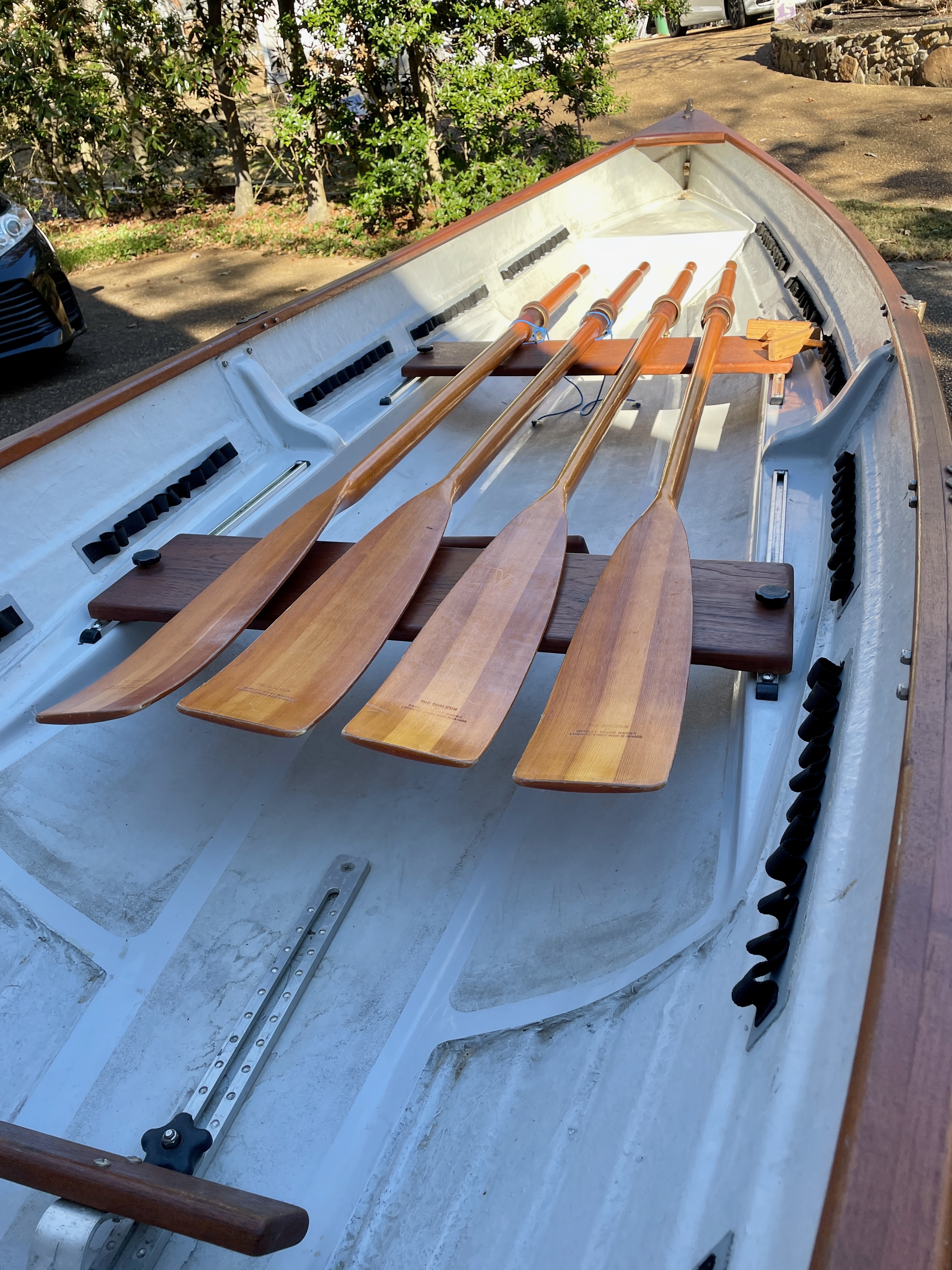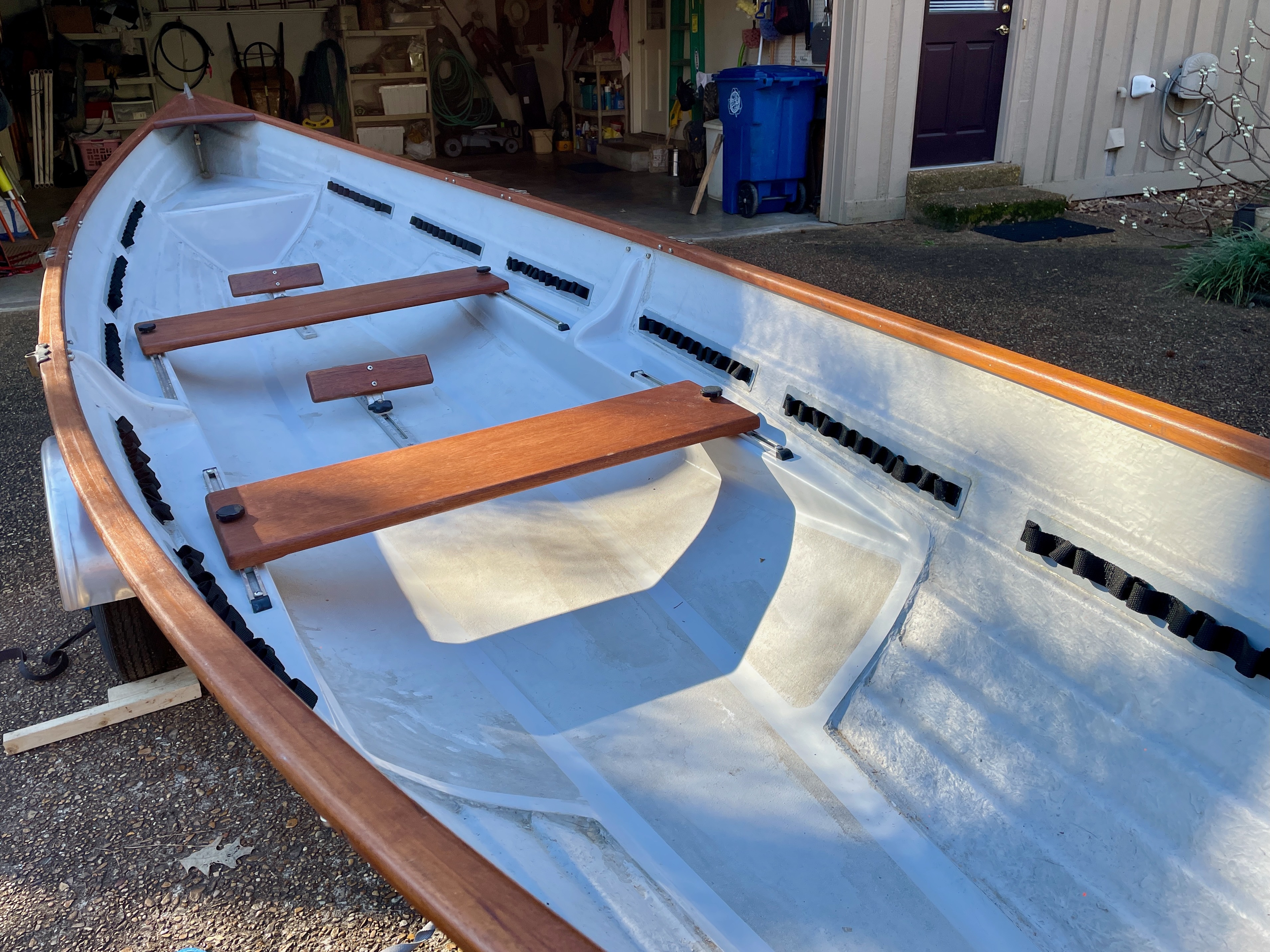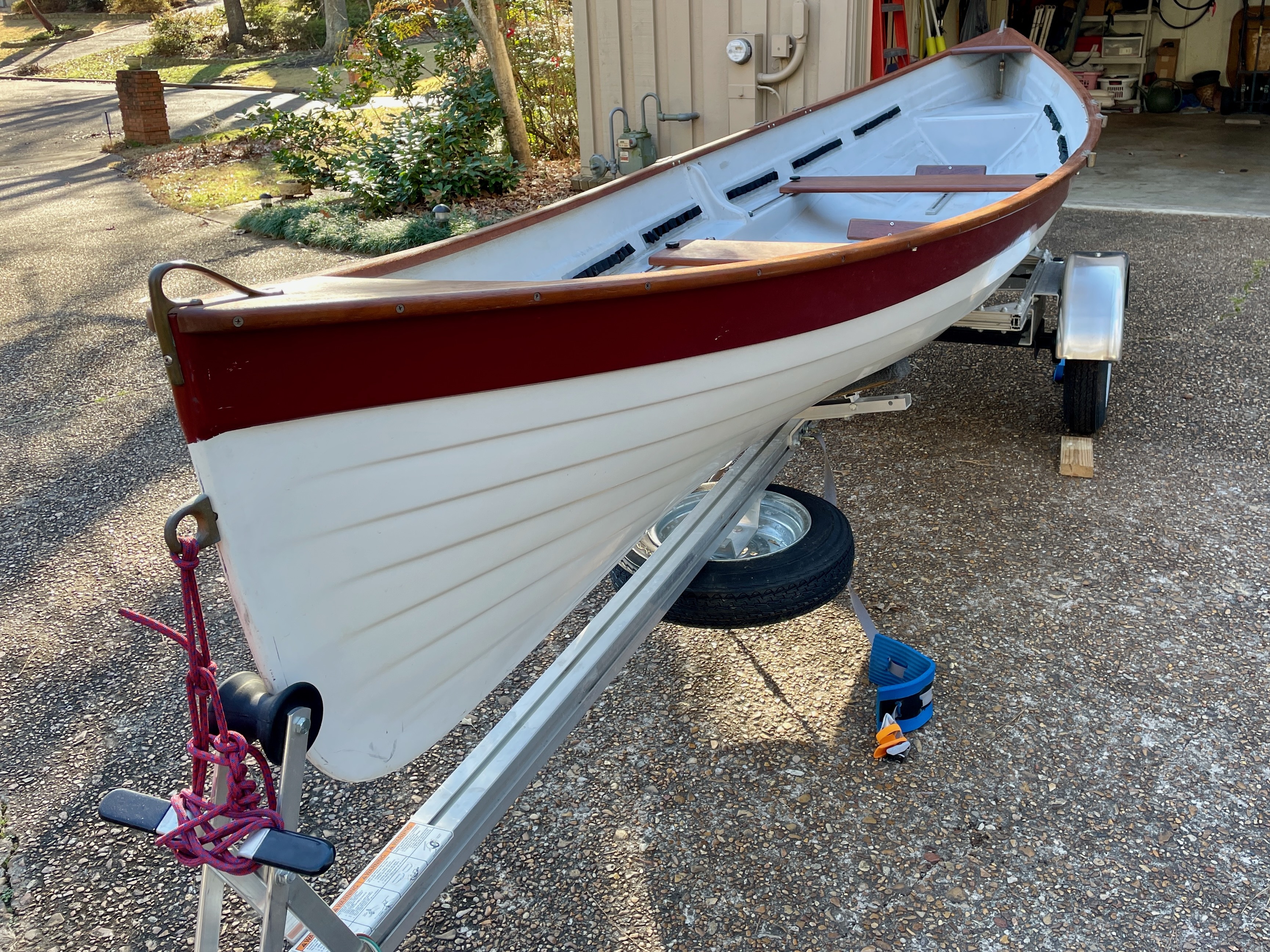 For Sale, Rossiter Louden Rowing Skiff. 17’ x 45”. Lapstrake fiberglass hull with full Teak trim. Daisy chain gear tie down strips. Adjustable seats and foot braces. 2 pairs of spoon bladed oars. Removable reverse card rowing compass. Storage cover included. Includes 1 1/2 year old Trailex SUT-220 ST trailer with torsion axel and spare tire. Can be rowed tandem, solo, or with a stern paddler. Always stored indoors. $4500